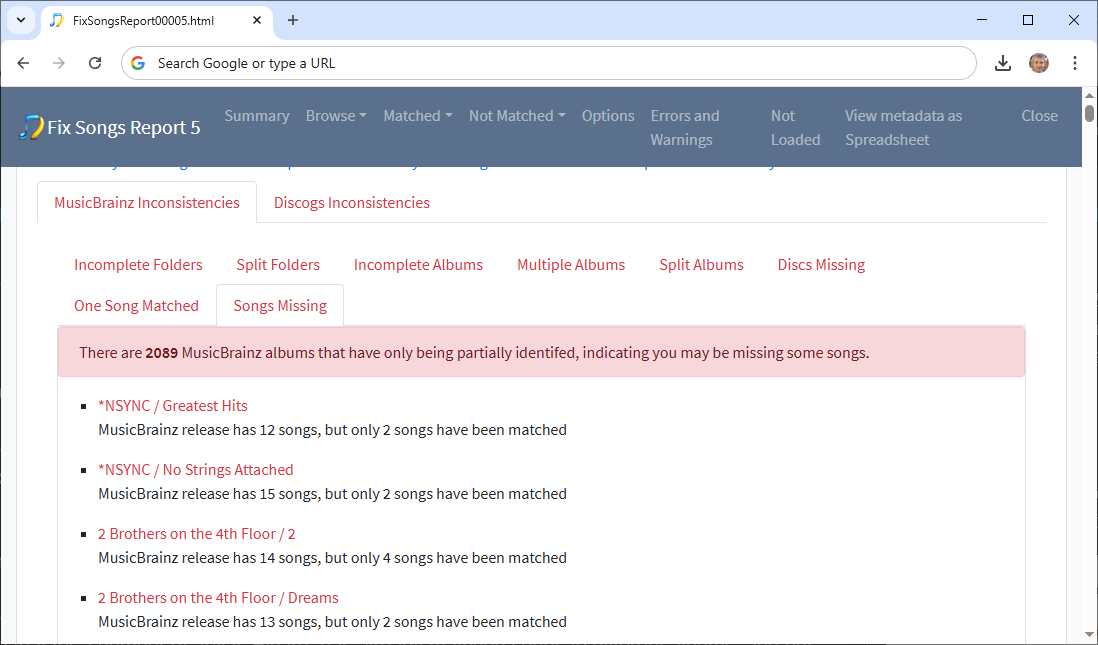 Now this is the real issue, it groups your songs by the MusicBrainz release they were matched to and then looks for MusicBrainz releases that have only been partially matched.