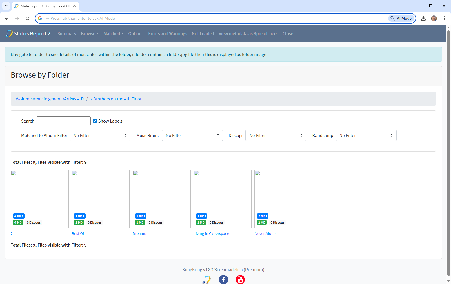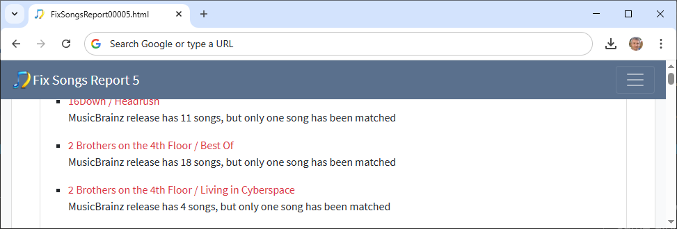 Using the 2 Brothers on the 4th Floor artist as an example, we see two albums with 4 and 2 songs matched