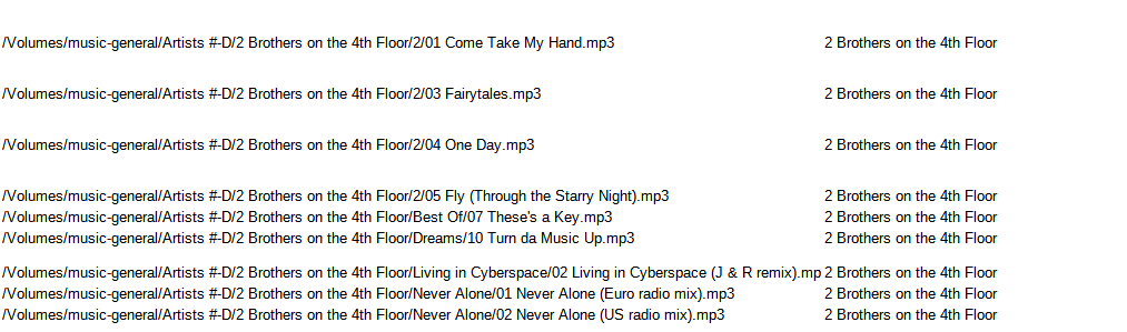 So, this would be my suggestion to sort out the mess, go down the list of artists listed in the Songs Missing list, and move all songs for that artist into a single folder without subfolder. for example put all the songs in /Volumes/music-general/Artists #-D/2 Brothers on the 4th Floor directly into that folder, whilst making exceptions for artists where you already have complete albums by them.