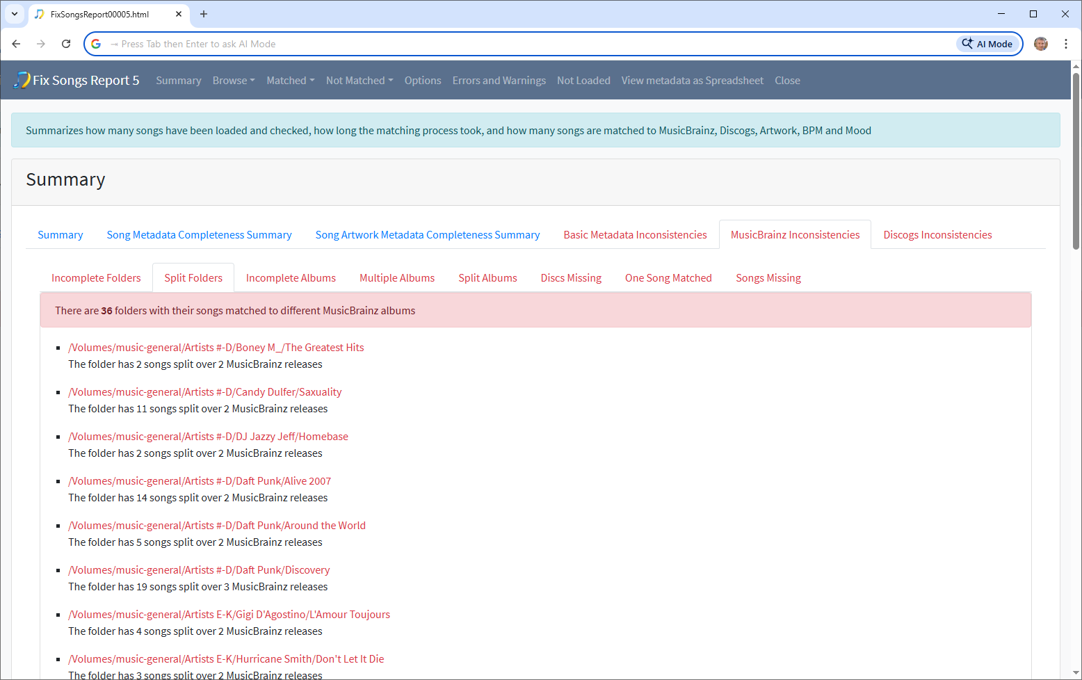 Looking at MusicBrainz Ids grouped by folder we see there are 36 folders with their songs split between a mix of different MusicBrainz albums these mostly fall into two categories, one where one song has been matched incorrectly to a different album or folders where you have duplicate songs.