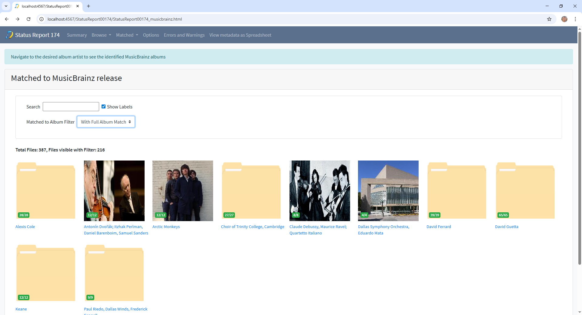 If I’m in a Status Report, and trying to fix all the “incomplete matches” from the Matched / Matched to MusicBrainz Release + Filter “Without Full Album Match” and then I drill down into a specific artist and album to find the issue, then I go into another tab and fix it, but then I want. to hit the back button… then I have to change filter to “With Full Album Match” and then back to “Without Full Album Match” because ithe application of the filter is not persistent.