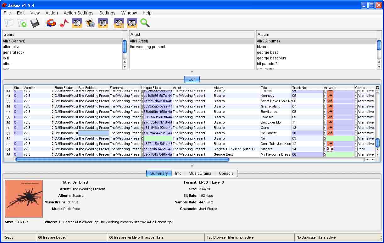 I am adding a detail panel to Jaikoz, thats shows details of the currently selected record. The first panel is a read only summary , but other panels are editable allowing you to change the details, and the changes get reflected in the datasheet immediately. The panels will contain information broadly similar to what you would get by selecting on ‘Get Info’ on a record within iTunes but will also contain additional MusicBrainz Info.