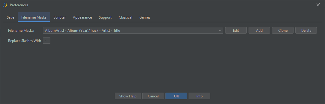 - Select Filename masks tab and find the Genre/Composer/Album/Track - Title mask