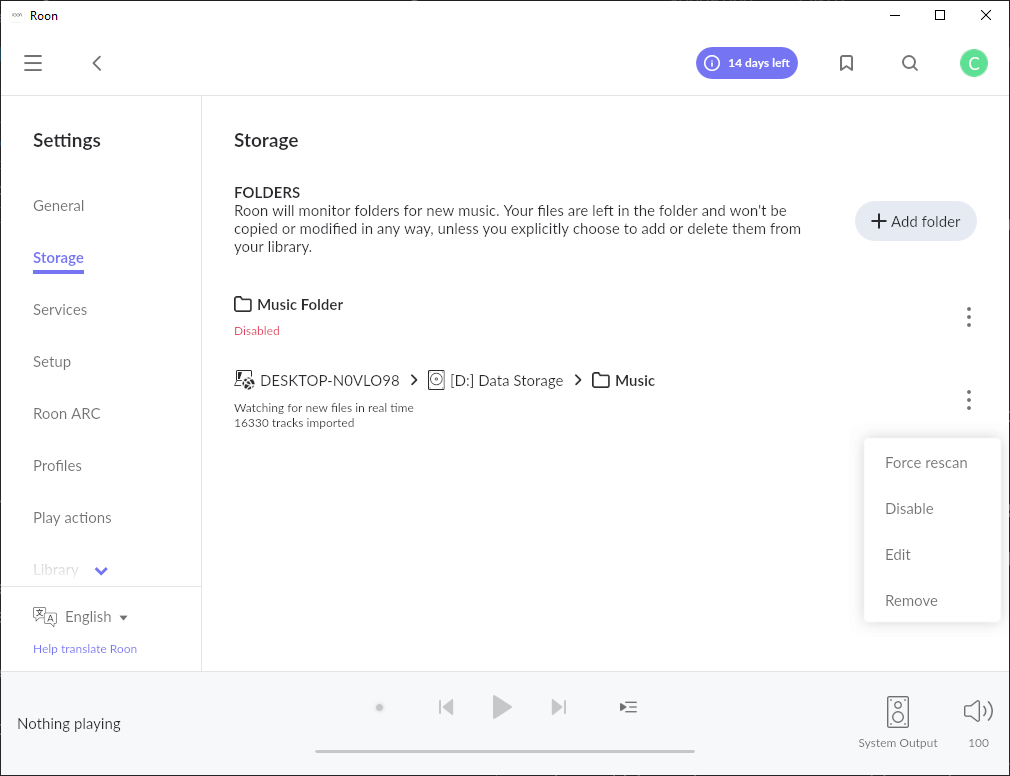 - To the right of the Music Folder click on the Three Dots icon and select Force Rescan