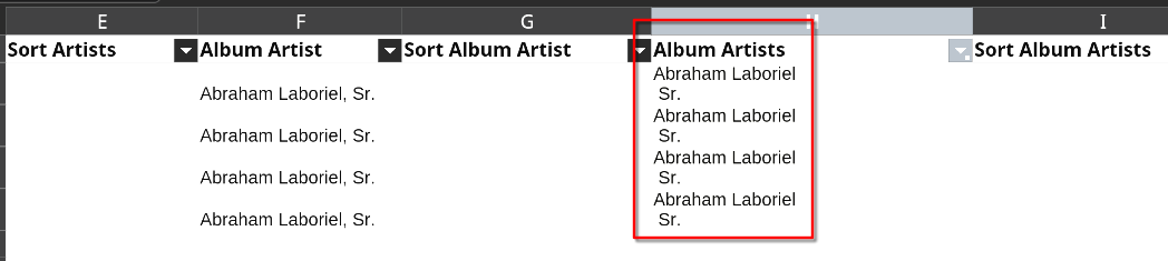 It looks like the comma in the Album Artists column has been mistaken for a delimiter and created a 2nd item. Is this a formatting error or would the fix have written to tags or a ; delimited tag to Album Artists (or whatever it maps to when written as a tag)?
