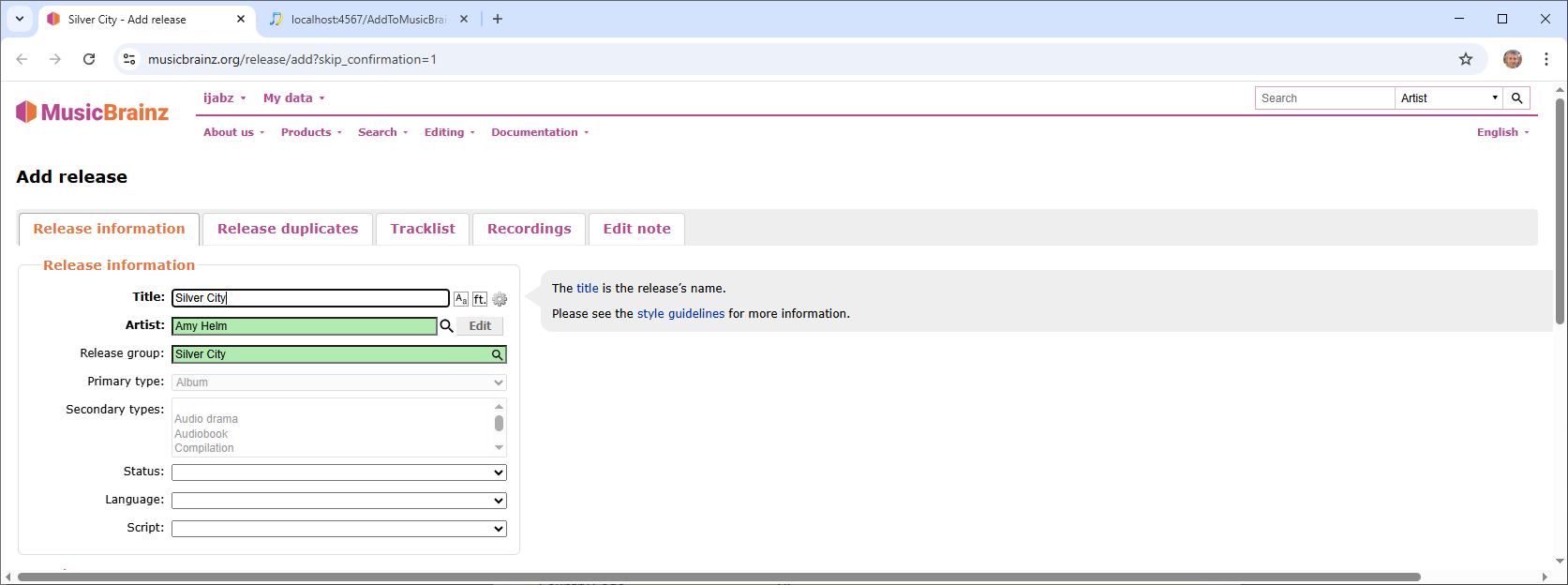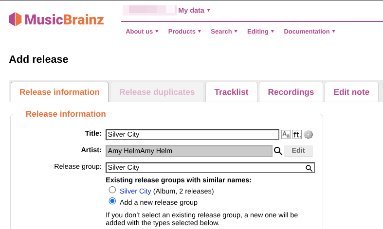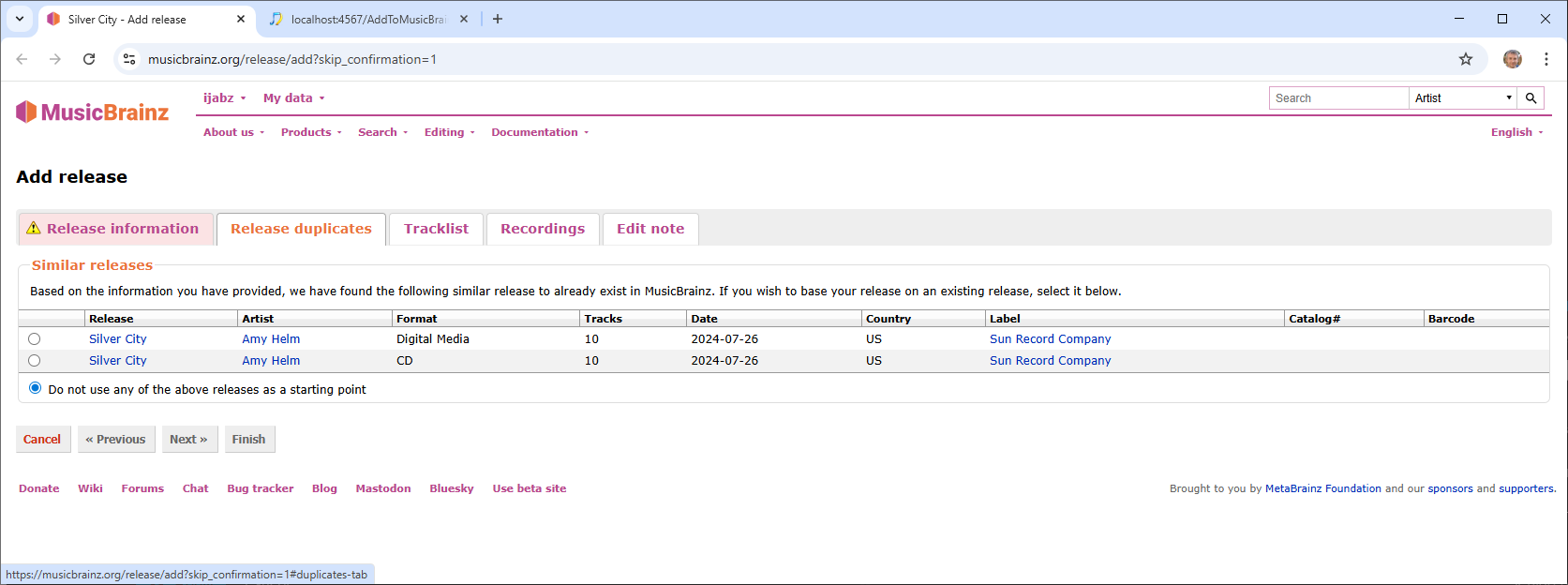 Now if the album is already in MusicBrainz then it should come up as a duplicate on the MusicBrainz Release Duplicates tab as it did in this case