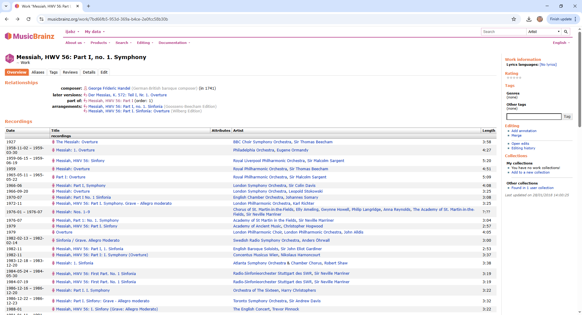 Now in this case the titles actually show the overall work Messiah, HWV 56 rather than the three parts that make up the overall Work and so deriving work from title gives us Messiah, HWV 56.