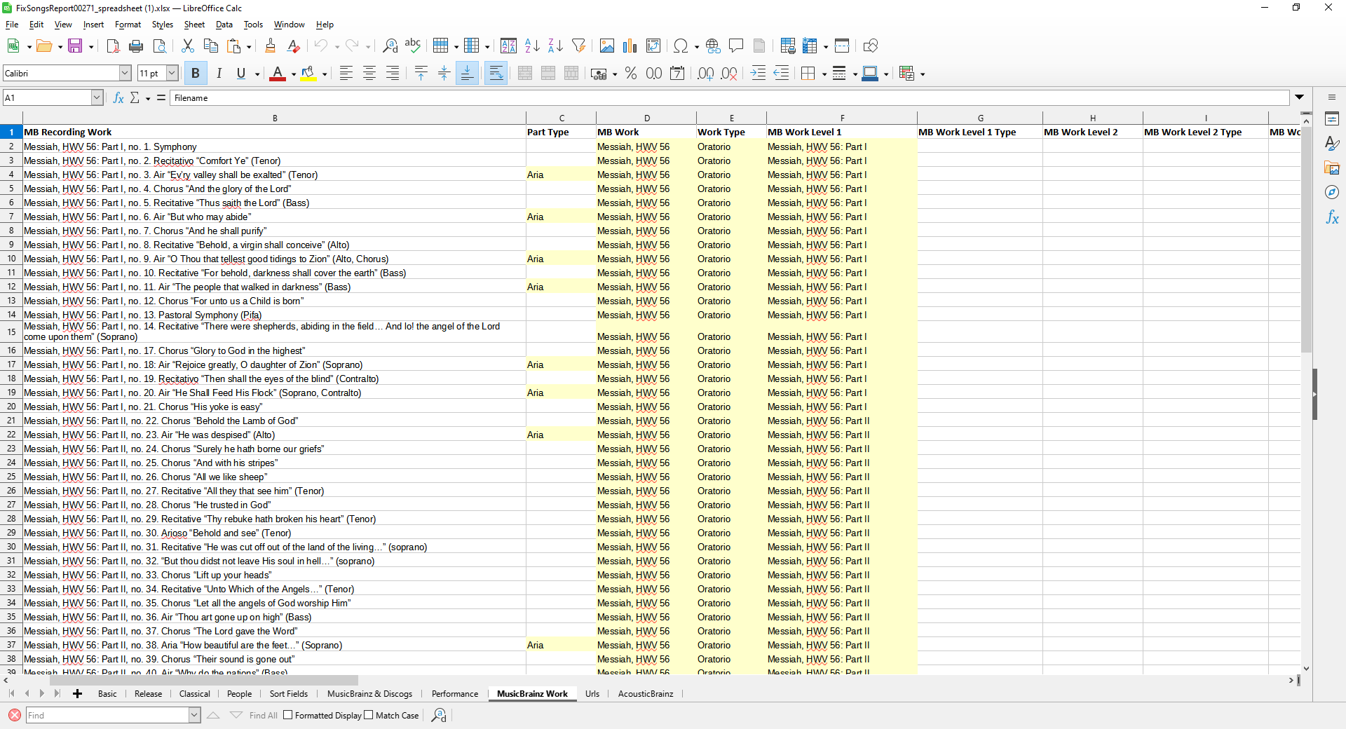 If we look at the MusicBrainz Work tab of the spreadsheet we can see that all tracks have the same value for MB Work, and the right part for the MB Work Level 1