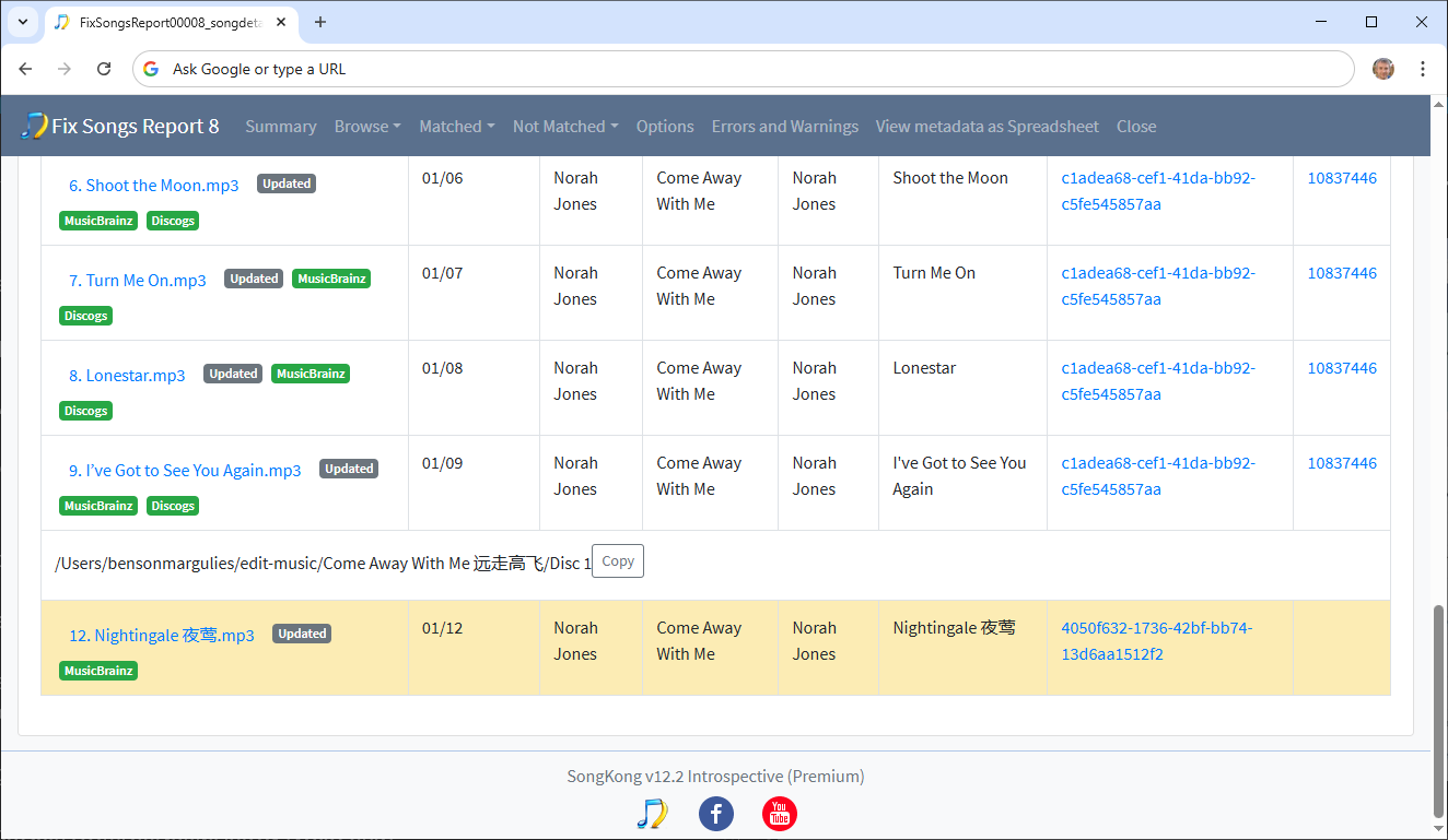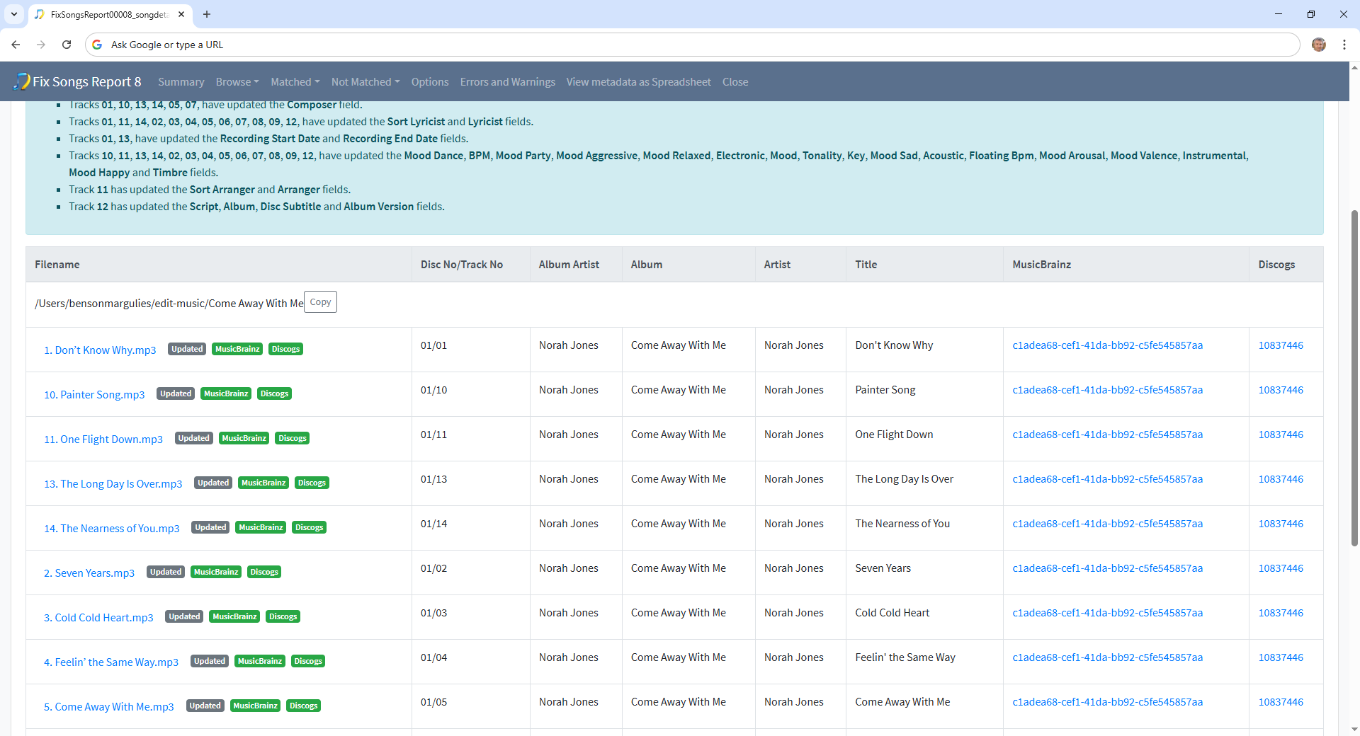 Shows a few albums such as Come Away With Me where songs with the same MusicBrainz Release Id are in different folders