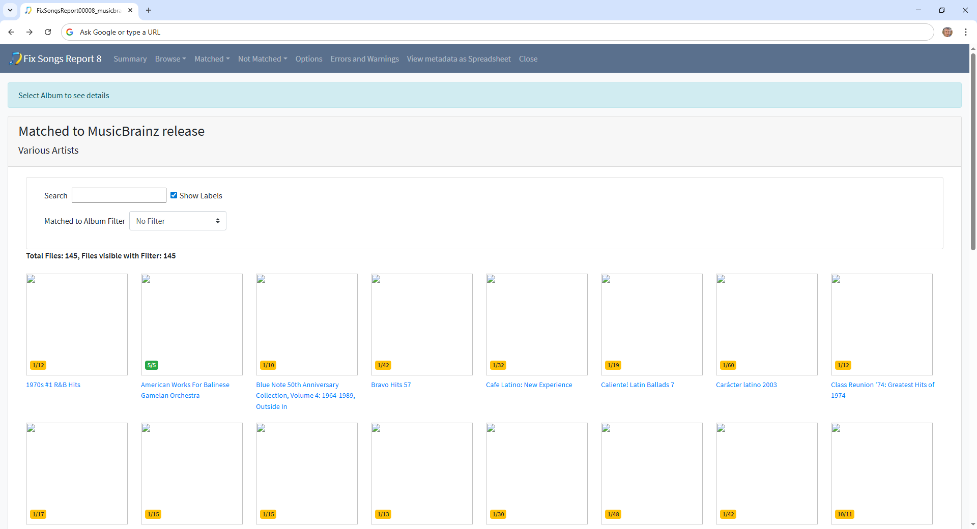 But what may be helpful is if you go to Matched:Matched to MusicBrainz section and then select the Various Artists artist. This shows the albums that have matched to Various Artists with their counts, if the badger is yellow rather than green only some song on the album have been matched. This may help track down the names of some of your compilations albums that have now had songs removed