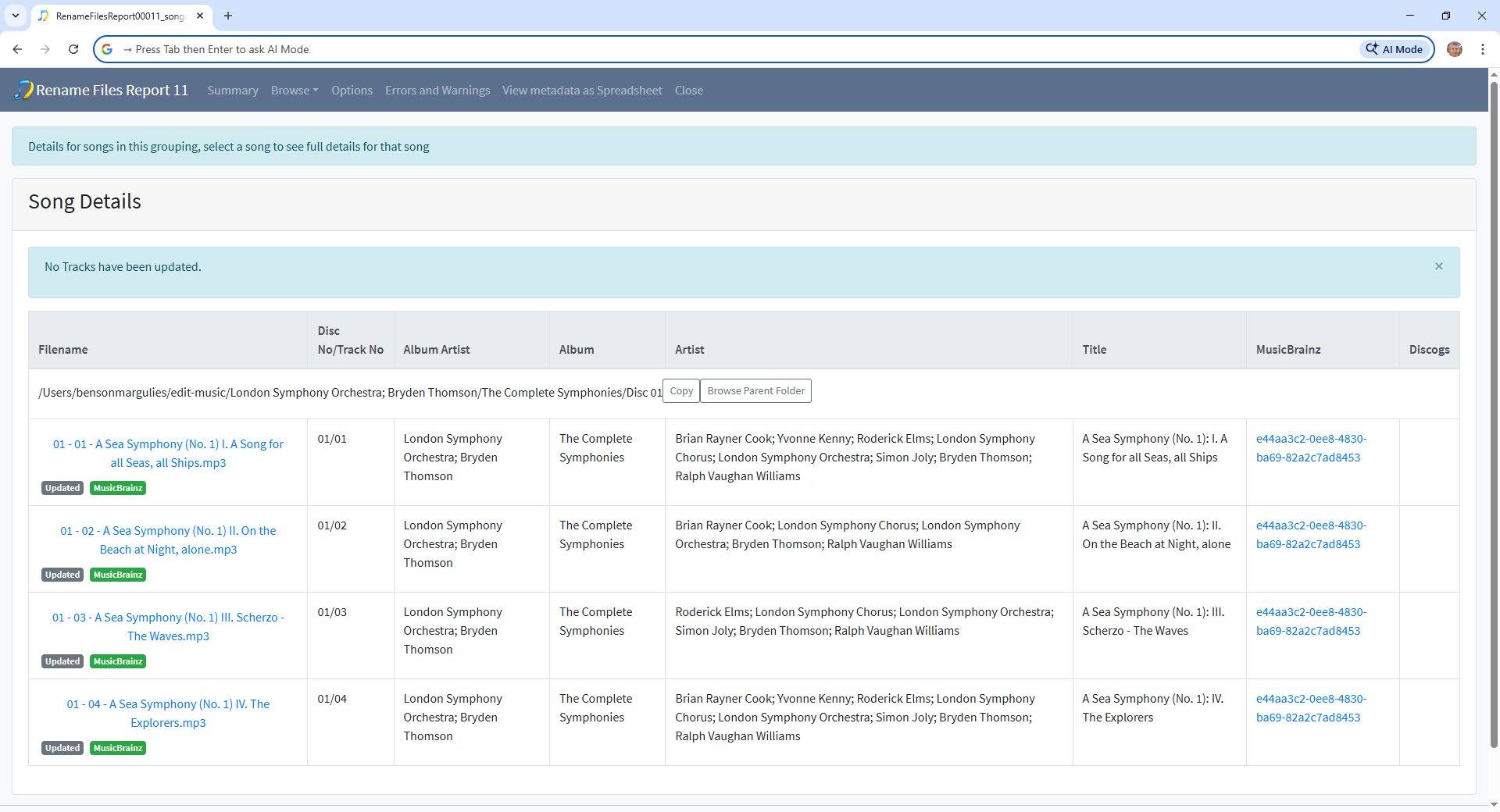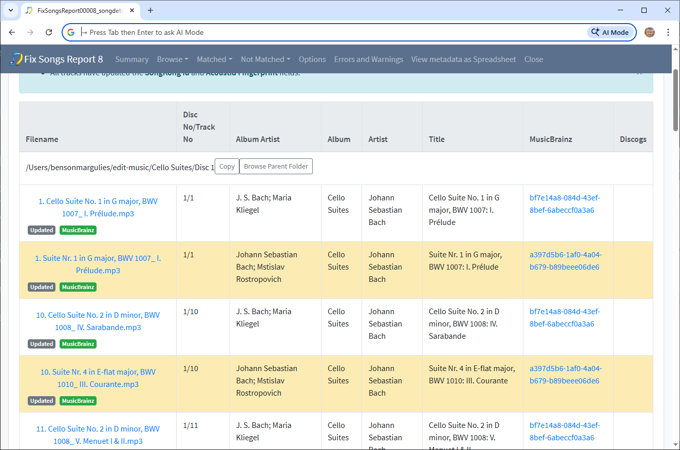 But, anyway it seems that it is correctly matched but at some point in the past the two albums were incorrecty put into the same folder perhaps by using a rename mask based on album title which is the same for both albums (Cello Suites), I don’t think this was done by SongKong since I can’t see any sign that you have run Rename Files task