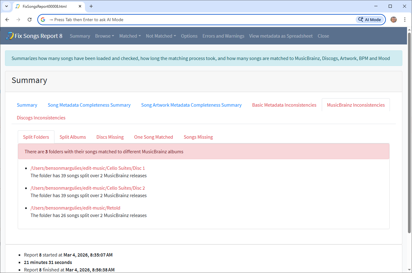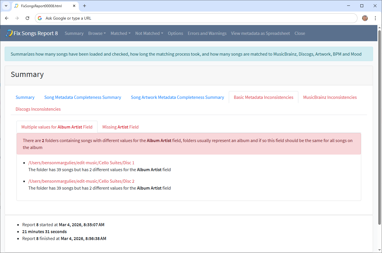 Hi, so just before you ran Status Report task you ran Fix Songs task and if you go to the Basic Metadata Inconsistencies/Multiple values for Album Artist tab we can see the problem folders
