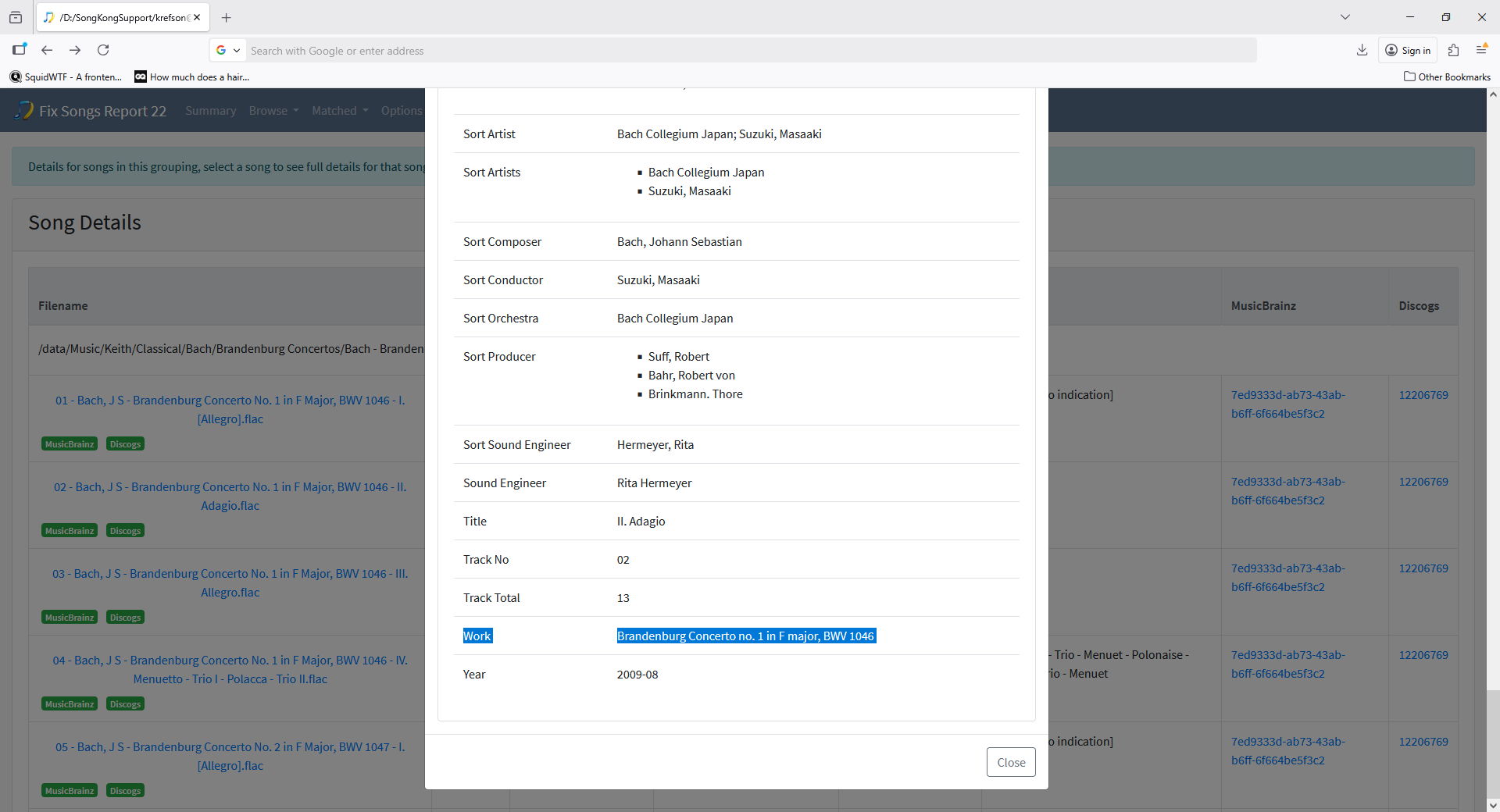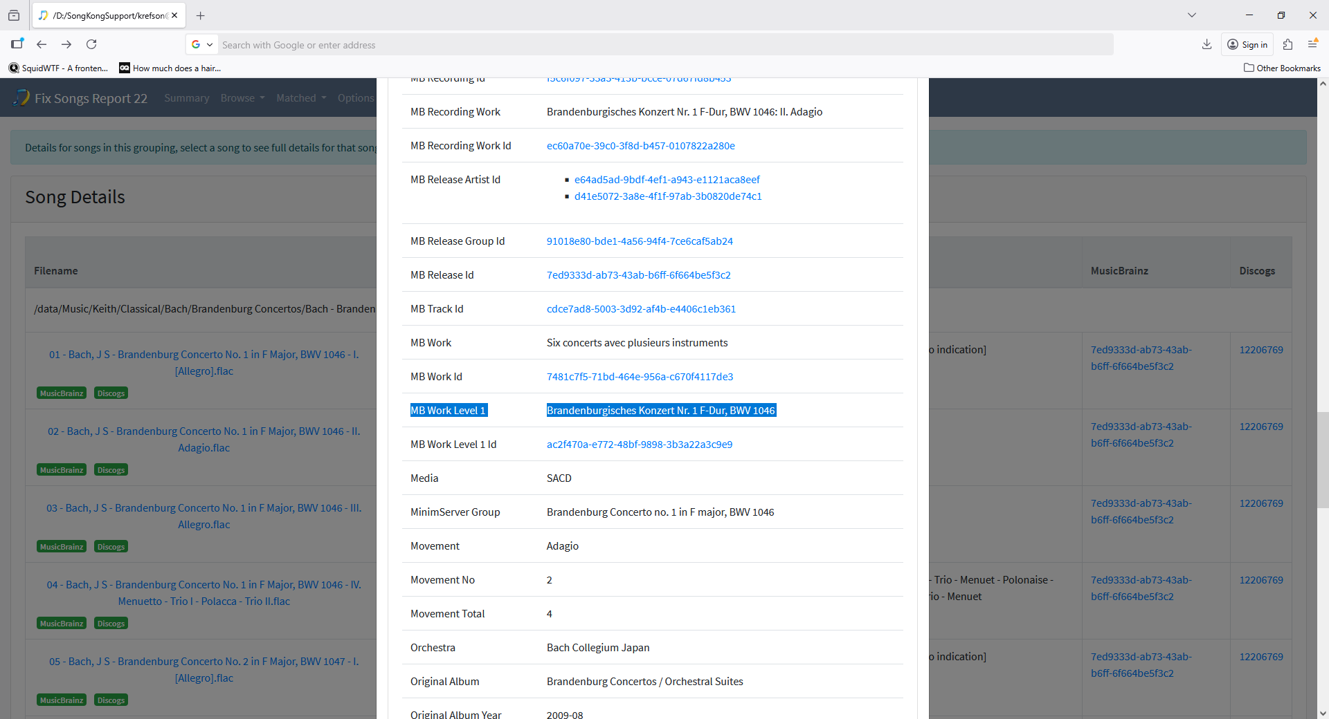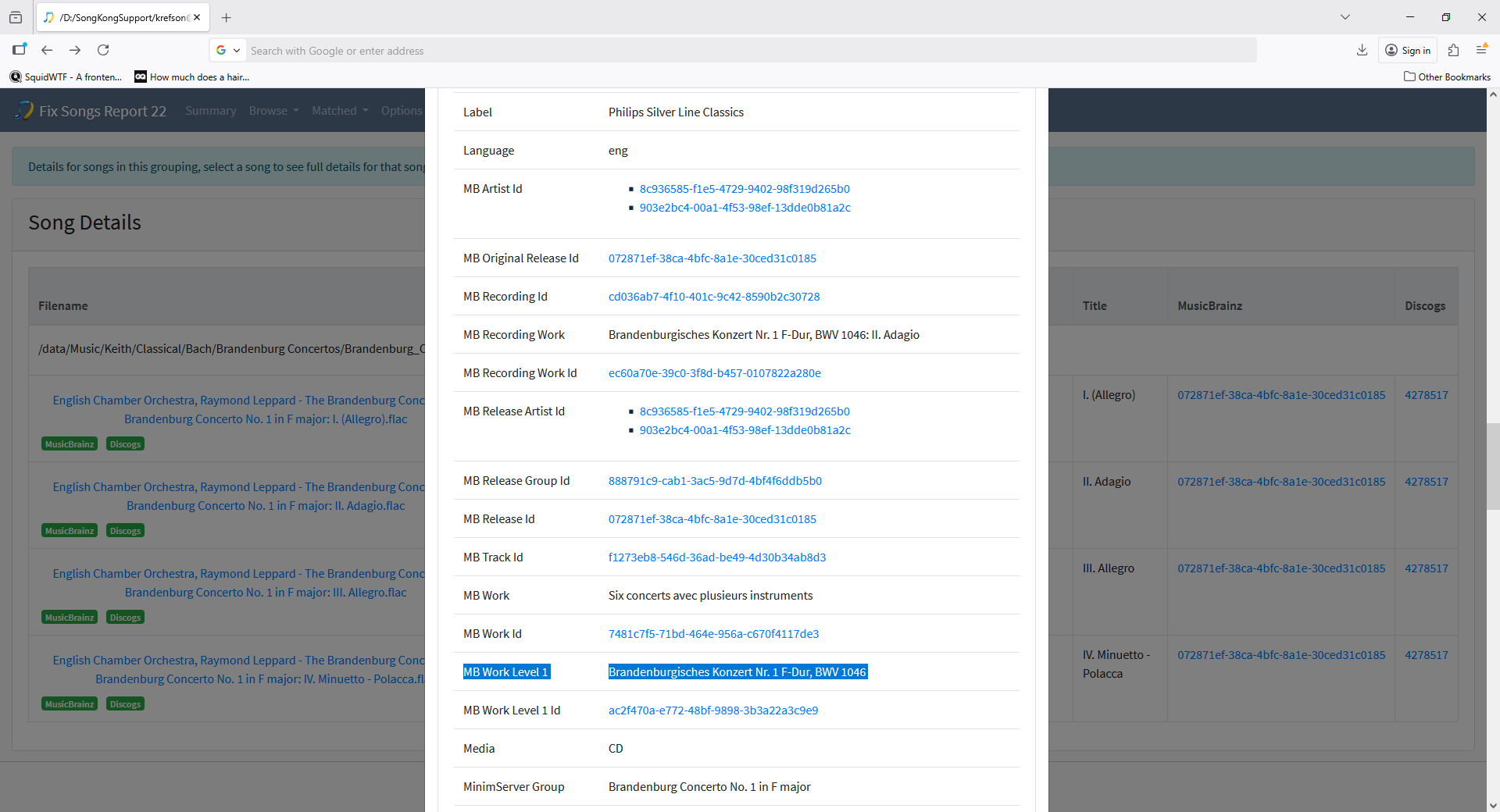 So here Work is set to Brandenburg Concerto No. 1 in F major, it doesn’t include the Bach Works Catalog reflecting the track listing on the album .Just like Example A MusicBrainz equivalent is stored in the MB Work Level 1 field as Brandenburgisches Konzert Nr. 1 F-Dur, BWV 1046 and the MB Ids point to exactly the same work