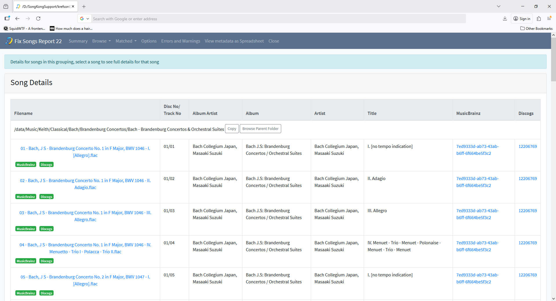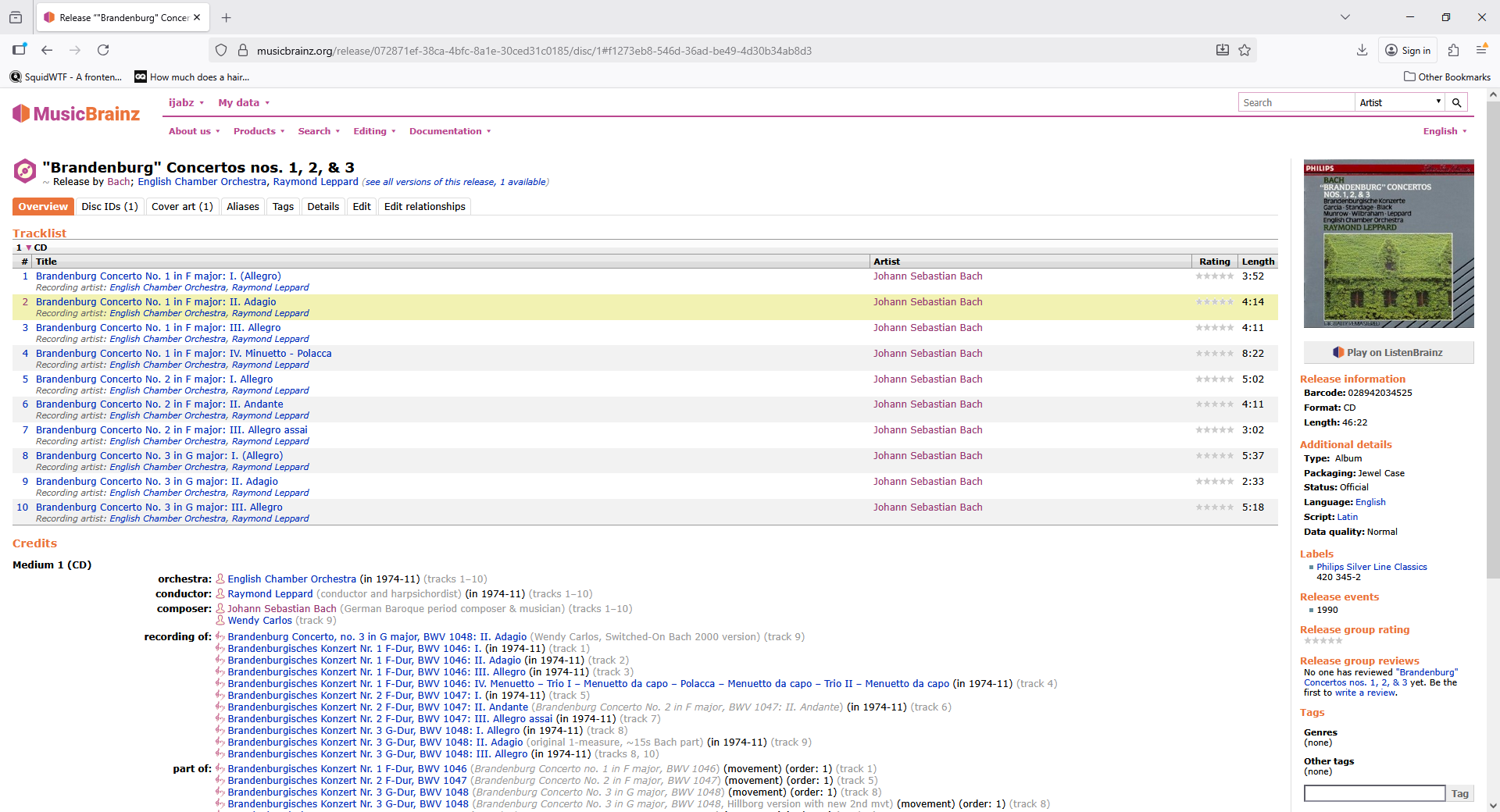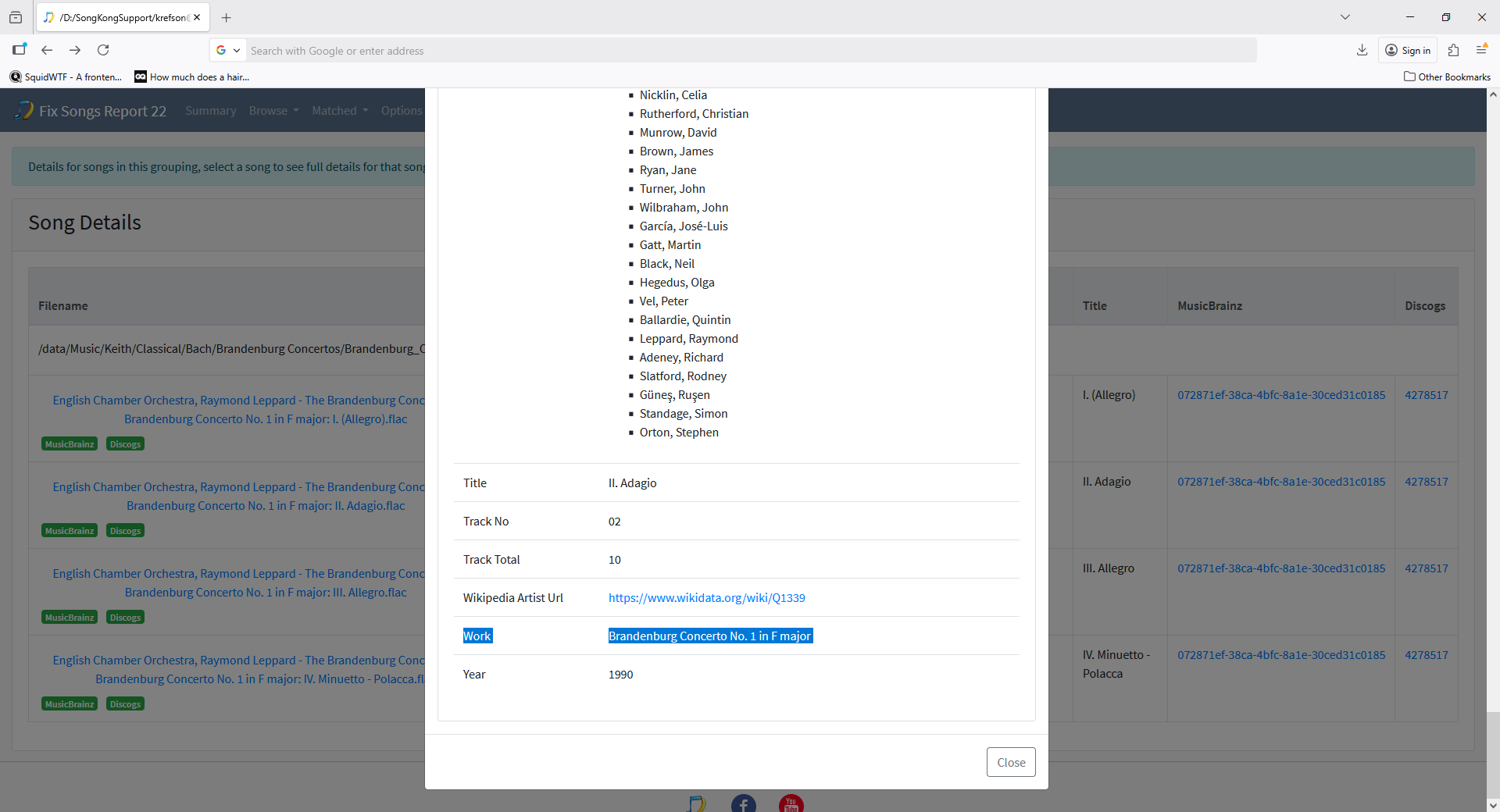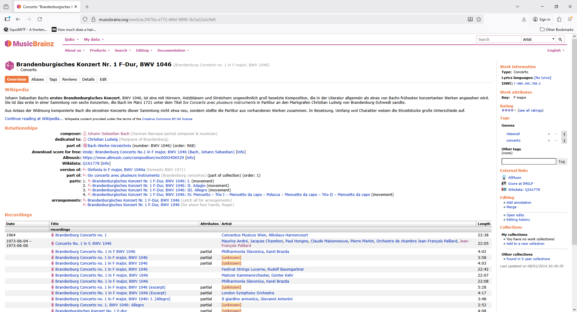 So here Work is set to Brandenburg Concerto No. 1 in F major, it doesn’t include the Bach Works Catalog reflecting the track listing on the album .Just like Example A MusicBrainz equivalent is stored in the MB Work Level 1 field as Brandenburgisches Konzert Nr. 1 F-Dur, BWV 1046 and the MB Ids point to exactly the same work