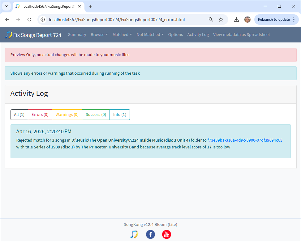 For Fix Songs success messages are added when songs are matched to a MusicBrainz or Discogs album as they are saved. But importantly if we were unable to match to an album but had some near misses then these are logged as information messages, this is helpful for working out why your albums were not identified by SongKong.