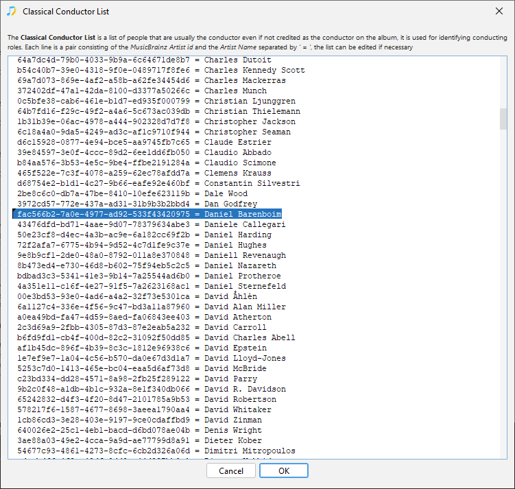And delete the line containing Daniel Barenboim and select OK this will not happen again, and negative consequences will be minimal (SongKong now just has one less metric with which to identify classical releases by Daniel Barenboim). If you manually delete the conductor and conductor sort field (or use MetaGrater) and then rerun Fix Songs they should not get re-added.