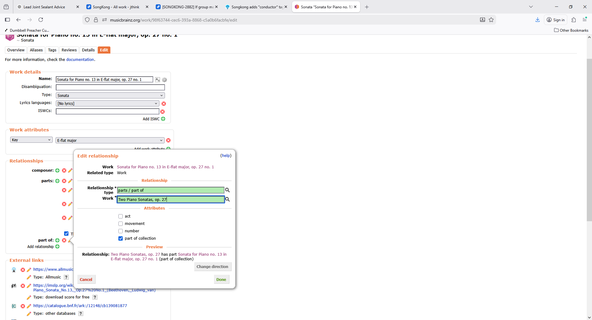 Okay Two Piano Sonatas, op. 27 has been added as a Work and the two actual Works have a part of relationship with with the addtional part of collection attribute enabled