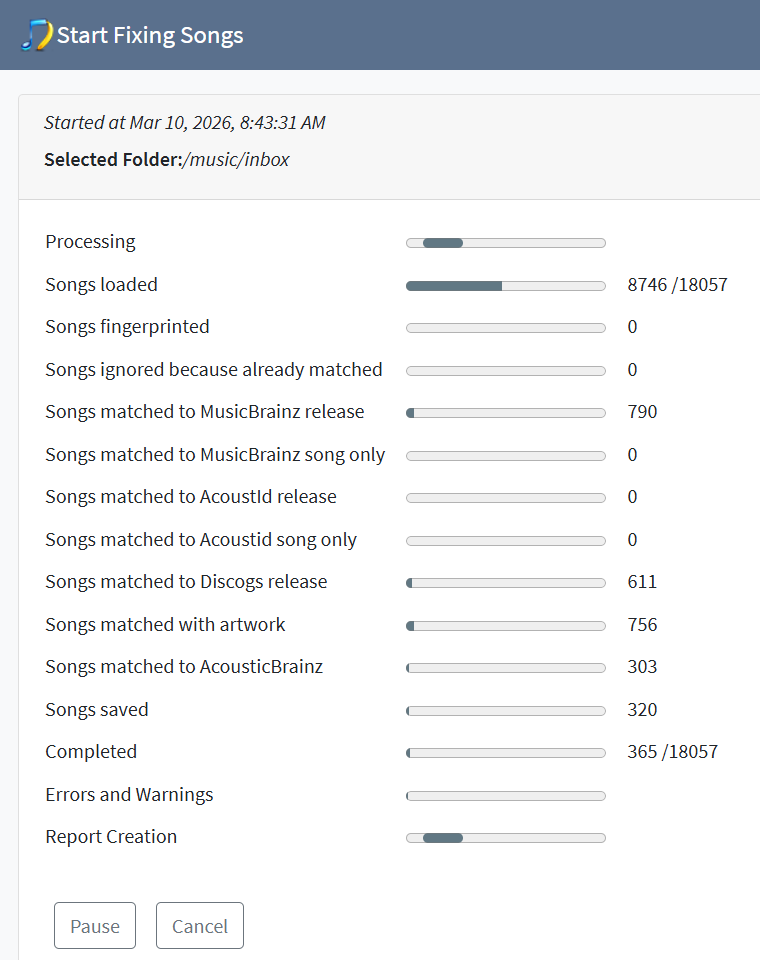 I am unable to complete a “Fix Songs” operation on my working directory. The /fixsongs.check_progress page appears to hang after a few hundred songs. It hangs for some time, then, my DSM becomes unresponsive, and then eventually the SongKong container crashes.